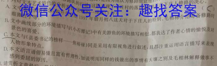 心心7.下列对文本艺术特色的分析鉴赏、正确的一项是(3分)D.文章详细描写动工当天修路队的行动,这既表现了下庄村的落后,也烘托出下庄人修路的决心。A..文中多处设置悬念,如A.文中多处设置悬念,如开头介绍1997年腊月初八这天对于下庄人的特别、毛相林介绍筹备修路时了八这天对于下庄人B.部分.文中画线部B.文中画线部分的环境描写与小石潭记》中有关游鱼的环境描写相似,都表达了作者心情的愉悦及对景色的喜爱。境描写相C.本文与《县委书记的榜样人物形象特点。一焦裕禄》同是采用有限视角进行叙述,且都注重运用语言描写来表现文D.本文语言通俗易懂且富有哲理性,如说明用同样的钱做出的事情有天壤之别及毛相林解释做事不感到委屈的原因。