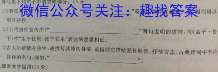 17.补写出下列句子中的空缺部分。(6分)(1)1)《春江花月夜》中“,,”写出人类存在绵延久长,明月共存。(2)《五代史伶官传序》“传序》“,”两句说明的道理,与《孟子·告下》中“生于忧患,死于安乐”表达的意思相近。(3)古人对荷情有独钟,或描写其绰约身姿,或借助它描绘夏日胜景、抒情言志,古典诗词中有许这样的名句三、语言文字运用(20分)名句,例如:“,”。