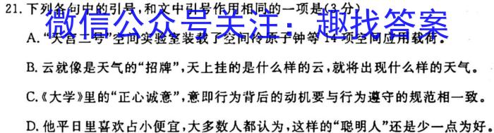 21.下列各句中的引号,和文中引号作用相同的一项是(3分)A.“天宫二号”空间实验室装载了空间冷原子钟等14项空间应用载荷,B.云就像是天气的“招牌”,天上挂的是什么样的云,就将出现什么样的天气。C.《大学》里的“正心诚意”,意即行为背后的动机要与行为遵守的规范相一致。D.他平日里喜欢占小便宜,大多数人都认为,这样的“聪明人”还是少一点为好。