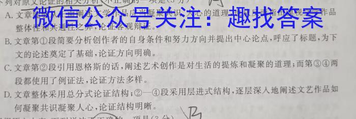 2.下列对原文论证的相关分析不正确的一项是(3分)AA.文章能够从正面阐述文学作品应当凝聚共识、人心的道理,也从反面指出漠视文学作品整体性和共通性之弊,论证客观辩证。B.文章第①段简要分析创作者的自身条件和努力方向并提出中心论点,呼应了标题,为下文的论述奠定了基础,论证方向明确。C.文章第②段引用恩格斯的话,阐述艺术创作是对生活的提炼和凝聚的道理;而第③④两段都使用了例证法,论证方法多样。D.文章整体采用总分式论证结构;②-④段采用层进式结构,逐层深人地阐述文艺作品如何凝聚共识凝聚人心,论证结构明晰。