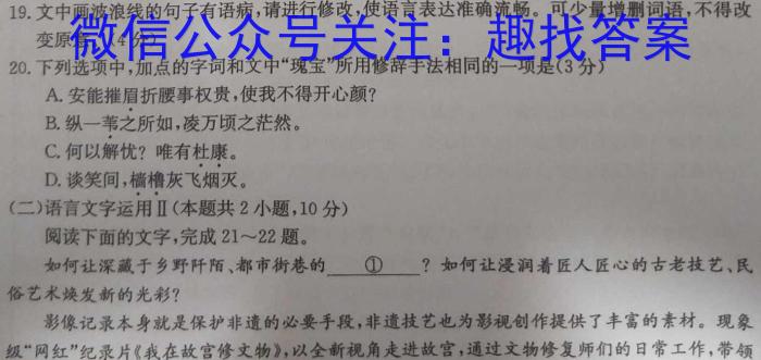 19.文中画波浪线的句子有语病,请进行修改,使语言表达准确流畅。可少量增删词语,不得改变原意。(4分)20.下列选项中,加点的字词和文中“瑰宝”所用修辞手法相同的一项是(3分)A.安能摧眉折腰事权贵,使我不得开心颜?B.纵一苇之所如,凌万顷之茫然。C.何以解忧?唯有杜康。D.谈笑间,樯橹灰飞烟灭。(二)语言文字运用Ⅱ(本题共2小题,10分)阅读下面的文字,完成题。21∼22如何让深藏于乡野阡陌、都市街巷的①?如何让浸润着匠人匠心的古老技艺、民俗艺术焕发新的光彩?