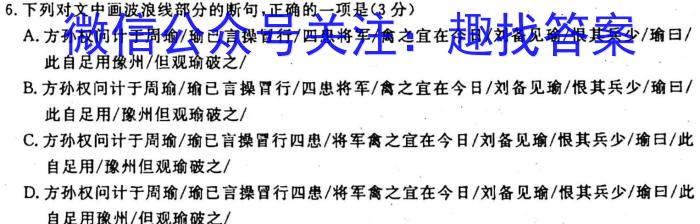 6.下列对文中画波浪线部分的断句,正确的一项是(3分)A.方孙权问计于周瑜/瑜已言操置行/四患将军/禽之宜在今日/刘备见瑜/恨其兵少/瑜曰/此自足用豫州/但观瑜破之/B.方孙权问计于周瑜/瑜已言操買行/四患将军/食之宜在今日/刘备见瑜/恨其兵少/瑜曰/此自足用/豫州但观瑜破之/C.方孙权问计于周瑜/瑜已言操冒行四忠/将军禽之宜在今日/刘备见瑜/恨其兵少/瑜日/此自足用/豫州但观瑜破之/D.方孙权问计于周瑜/瑜已言操冒行四患/将军禽之宜在今日/刘备见瑜/恨其兵少/瑜曰/此自足用豫州/但观瑜破之/