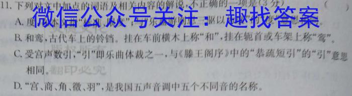 11.下列对文中加点的词语及相关内容的解说,不正确的一项是(3分)A.度,在本文指“标准、限度”;与“乐盘游则思三驱以为度”的“度”意思相同。B.和鸾,古代车上的铃铛。挂在车前横木上称“和”,挂在轭首或车架上称“鸾”。C.受宫声数引,“引”即乐曲体裁之一,与《滕王阁序》中的“恭疏短引”的“引”意思相同。印必究D.“宫、商、角、微、羽”,是我国五声音调中五个不同音的名称。