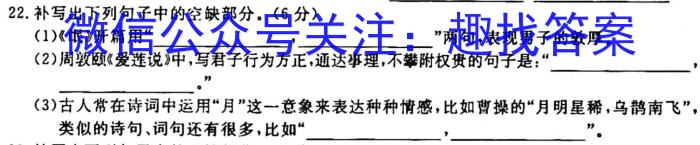 22.补写出下列句子中的空缺部分。(6分)(1)k氓》开篇用“,”两句,表现男子的敦厚。(2)周敦颐《爱莲说》中,写君子行为方正,通达事理,不攀附权贵的句子是:“。”(3)古人常在诗词中运用“月”这一意象来表达种种情感,比如曹操的“月明星稀,乌鹊南飞”,类似的诗句、词句还有很多,比如“,