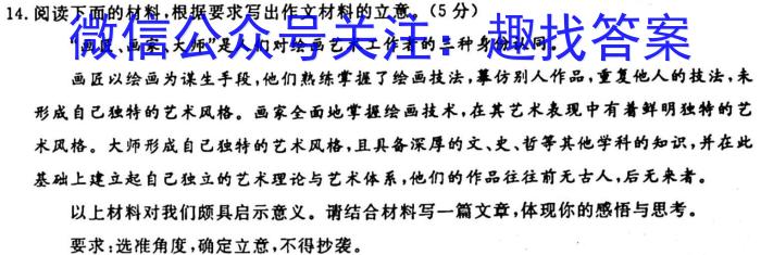 14.阅读下面的材料,根据要求写出作文材料的立意。(5分)“画匠、画家、大师”是人们对绘画艺术工作者的三种身份认同。画匠以绘画为谋生手段,他们熟练掌握了绘画技法,基仿别人作品,重复他人的技法,未形成自己独特的艺术风格。画家全面地掌握绘画技术,在其艺术表现中有着鲜明独特的艺术风格。大师形成自己独特的艺术风格,且具备深厚的文、史、哲等其他学科的知识,并在此基础上建立起自己独立的艺术理论与艺术体系,他们的作品往往前无古人,后无来者。以上材料对我们颇具启示意义。请结合材料写一篇文章,体现你的感悟与思考。要求:选准角度,确定立意,不得抄袭。