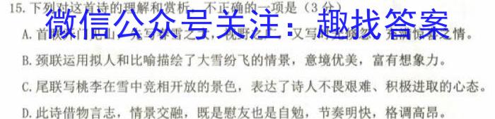15.下列对这首诗的理解和赏析,不正确的一项是(3分)A.首联开门见山,先写春雪之大,视野之广,又写时光倏忽,充满惊喜之情。B.颈联运用拟人和比喻描绘了大雪纷飞的情景,意境优美,富有想象力。C.尾联写桃李在雪中竞相开放的景色,表达了诗人不畏艰难、积极进取的心态。D.此诗借物言志,情景交融,既是慰友也是自勉,节奏明快,格调高昂。