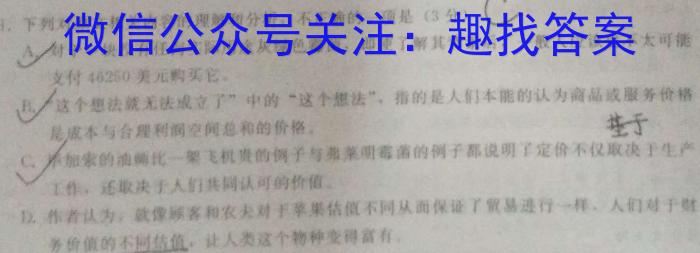 (编自赫克托·麦克唐纳《后真相时代》,刘清山译)1.下列对原文相关内容的理解和分析,不正确的一项是(3分)CA对于块没有任实际用途灰绿色霉菌,即使了解其背景后,一般人应该也不太可克付4250美元购买它B这全法无法成了”中的“这个想法”,指的是人们本能的认为商品或服务价格成本与合理利润空总和的价格,基子加索的油比一架飞机贵的倒子与明霉的例子都说明了定价不仅取决于生产工作,还取决于人们共网认问的价值D.作者认为,就像客和农对果依值不同从面保证了易遊行一样,人们对于财筹价值的不同值,人类这个物种变得富有