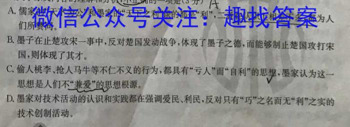 1.下列关于原文内容的理解和分析,不正确的一项是(3分)AA.儒家的“天下为公”和墨家的“天下之利”谈的都是“利”,二者在认识上相差不多,都为人们所赞同。B.黑子在止楚攻宋一事中,反对楚国发动战争,体现了墨子之德,而能够制止楚国攻打宋国,则体现了其才。C.偷人桃李、抢人马牛等不仁不义的行为,都具有“亏人”而“自利”的思想,墨家认为这一思想是人们不“兼爱”的思想根源。D.黑家对技术活动的认识和实践都在强调爱民、利民,反对只有“巧"之名而无“利”之实的技术创制活动。