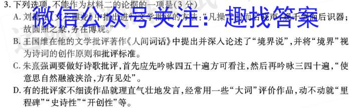 3.下列选项,不能作为材料二的论据的一项是(3分)A.刘勰在《文心雕龙》中指出进行文学批评的方法:“凡操千曲而后晓声,观千剑而后识器;故圆照之象,务在博观。”B.王国维在他的文学批评著作《人间词话》中提出并深入论述了“境界说”,并将“境界”视为诗词的创作原则和批评标准。C.朱熹强调要做好诗歌批评,首先应先吟咏四五十遍方可看注,然后再吟咏三四十遍,“使意思自然融液浃洽,方有见处”。D.有的批评家不细读作品就理直气壮地发言,经常用一些“大词”评价作品,动不动就“里程碑”“史诗性”“开创性”等。
