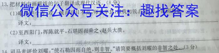 13.把材料中画横线的句子翻译成现代汉语。(8分)(1)曜带甲十万,攻一城而百日不克,师老卒怠,以我初锐击之,可一战而禽也。译文:(2)至西阳门,挥陈就平,石堪因而乘之,赵兵大溃。译文:14.司马光评价刘曜:“使石勒因而自绝,则非智。”请简要概括刘曜的非智之处。(3分)