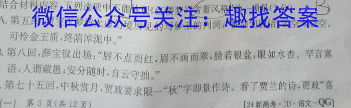 3.结合材料内容,下列选项中不能体现《红楼梦》“含蓄风格”的一项是(3分))BA.第五回,贾宝玉梦游太虚幻境所见的写妙玉的判词:“欲洁何曾洁,云空未必空。可怜金玉质,终陷淖泥中。”B.第八回,薛宝钗出场:“唇不点而红,眉不画而翠,脸若银盆,眼如水杏。罕言寡语,人谓藏愚;安分随时,自云守拙。”C.第七十五回,中秋赏月,贾政要求限一“秋”字即景作诗。看了贾兰的诗,贾政“喜【24新高考·JD·语文--QG