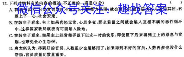 12.下列对材料有关内容的概述,不正确的一项是(3分)()A.韩非子认为,只要赏罚制度不超出人们的能力范围,就会使不同能力层次的人各得其所,君臣上下一心,社会安定。B.在韩非子看来,主上如果喜怒无常,心思多变,那么君臣之间就会陷人互相不满的恶性循环中,这样国家政局就极有可能陷人险地,C.在韩非子看来,如果主上经常侮弄臣下以求一时的快乐,即使臣下后来得到主上的恩惠与赏赐,也难免会心生怨恨。D.唐太宗认为,得到好的官员,人数虽少也足够用了;如果得到不好的官员,人数再多也没什么帮助,官员质量比数量重要。