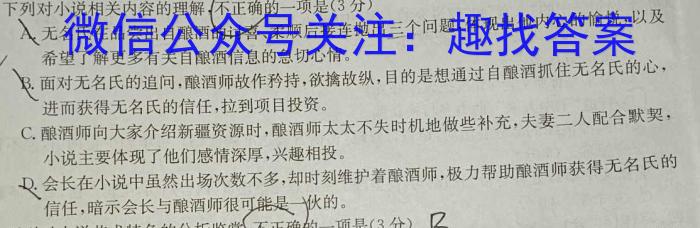6.下列对小说相关内容的理解解不正确的一项是(3分)无名氏在品尝出自酿酒的讨喜、柔顺后接连抛出三个问题,体现出他内心的愉悦,以及C希望了解更多有关自酿酒信息的急切心情。B.面对无名氏的追问,酿酒师故作矜持,欲擒故纵,目的是想通过自酿酒抓住无名氏的心,进而获得无名氏的信任,拉到项目投资。C.酿酒师向大家介绍新疆资源时,酿酒师太太不失时机地做些补充,夫妻二人配合默契,小说主要体现了他们感情深厚,兴趣相投。D.会长在小说中虽然出场次数不多,却时刻维护着酿酒师,极力帮助酿酒师获得无名氏的信任,暗示会长与酿酒师很可能是伙的。
