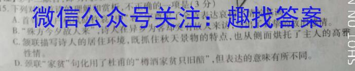 15.下列对这首诗的理解和赏析,不正确的一项是(3分)DA.首句“万户秋风砧杵哀”中“哀”字奠定了全诗表达哀伤之情的基调。B.“殊方今夕故人来”,诗人在异乡为客却突有故人来访,写出了真挚的故旧感情。C.颔联描写诗人的居住环境,既抓住秋天景物的特点,也从侧面烘托了主人的高雅性情。D.颈联“家贫”句化用了杜甫的“樽酒家贫只旧酪”,但表达的意味有所不同。