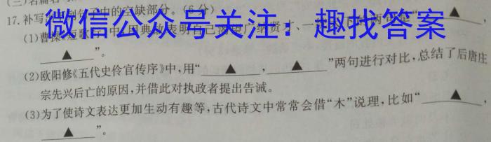 17.补写出下列句子中的空缺部分。(6分)▲(1)曹操《短歌行》中,用典故表明自己渴望广纳贤才、一统天下的两句是“▲”。”两句进行对比,总结了后庄(2)欧阳修《五代史伶官传序》中,用“▲(2)宗先兴后亡的原因,并借此对执政者提出告诫。(3)为了使诗文表达更加生动有趣等,古代诗文中常常会借“木”说理,比如“▲▲”
