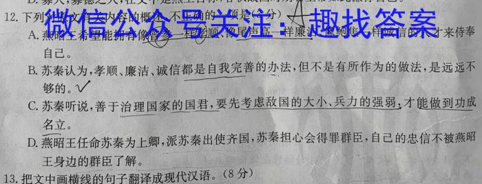 12.下列对原文有关内容的概述,不正确的一项是(3分))、△A.燕昭王希望能拥有像曾参一样孝顺、像尾声高一样廉洁、像鲍焦一样诚信的人才来侍奉自己。B.苏秦认为,孝顺、廉洁、诚信都是自我完善的办法,但不是有所作为的做法,是远远不够的。C.苏秦听说,善于治理国家的国君,要先考虑敌国的大小、兵力的强弱,才能做到功成名立。D.燕昭王任命苏秦为上卿,派苏秦出使齐国,苏秦担心会得罪群臣,自己的忠信不被燕昭王身边的群臣了解。13.把文中画横线的句子翻译成现代汉语。(8分)