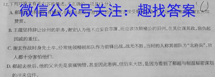 12.下列对原文有关内容的概述,不正确的一项是(3分)(A.郗超虽然和谢氏有嫌隙,但听说谢安举荐自己的侄子谢玄接受朝廷诏命后,他还是对谢安和谢玄赞赏。B.王蕴坚持辞让徐州的职务,谢安认为他不应妄自菲薄,而应该依照褚公的旧例,在其位谋其政,肩负起国戚的重任。C.谢玄作战时身先士卒,经常统领精锐部队作为前锋出战,战无不胜,当时的人称其部队为“北府兵”,敌人都十分害怕他们。D.郑超去世后,他的父亲先是哀痛惋惜,甚至因此患病,但后来大怒,是因为看到了郗超与桓温秘密谋刬的往来信件。
