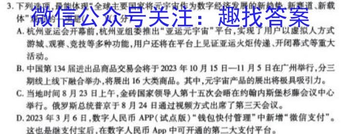 3.下列选项,最能体现“全球主要国家将元宇宙作为数字经济发展的新趋势、新赛道、新载体”观点的一项是()(3分)A.杭州亚运会开幕前,杭州亚组委推出“亚运元宇宙”平台,实现了用户以虚拟人方式游城、观赛,竞技等多种功能,用户还将在平台上见证亚运火炬传递、开闭幕式等重大活动。B.中国第134届进出品商品交易会将于2023年10月15日一11月5日在广州举行,分三期线上线下融合举办,将展出16大类商品。其中,元宇宙产品的展出将极具吸引力。C.当地时间8月23日上午,金砖第十五次会晤在约翰内斯堡杉藤会议中心举行。俄罗斯总统普京于8月24日通过视频方式出席了第三天会议。D.2023年3月6日,数字人民币APP(试点版)“钱包快付管理”中新增“微信支付”。这也是继支付宝后,在数字人民币App中可开通的第二大支付平台。