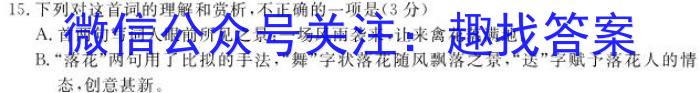15.下列对这首词的理解和赏析,不正确的一项是(3分)A.首两句写词人眼前所见之景:一场风雨袭来,让来禽花落满地。B.“落花”两句用了比拟的手法,“舞”字状落花随风飘落之景,“送”字赋予落花人的情态,创意甚新。