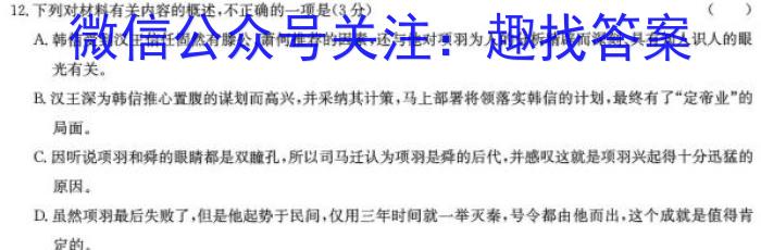 12.下列对材料有关内容的概述,不正确的一项是(3分)()A.韩信受到汉王信任固然有滕公、萧何推荐的因素,还与他对项羽为人的分析精辟而深刻、具有知人识人的眼光有关。B.汉王深为韩信推心置腹的谋划而高兴,并采纳其计策,马上部署将领落实韩信的计划,最终有了“定帝业”的局面。C.因听说项羽和舜的眼睛都是双瞳孔,所以司马迁认为项羽是舜的后代,并感叹这就是项羽兴起得十分迅猛的原因。D.虽然项羽最后失败了,但是他起势于民间,仅用三年时间就一举灭秦,号令都由他而出,这个成就是值得肯定的。