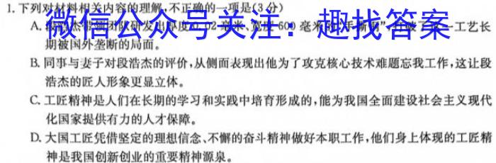 1.下列对材料相关内容的理解,不正确的一项是(3分)A.段浩杰带领团队研发出厚度0.02毫米、宽度600毫米的“手撕钢”,打破了这一工艺长期被国外垄断的局面。B.同事与妻子对段浩杰的评价,从侧面表现出他为了攻克核心技术难题忘我工作,这让段浩杰的匠人形象更显立体。C.工匠精神是人们在长期的学习和实践中培育形成的,能为我国全面建设社会主义现代化国家提供有力的人才保障。D.大国工匠凭借坚定的理想信念、不懈的奋斗精神做好本职工作,他们身上体现的工匠精神是我国创新创业的重要精神源泉。
