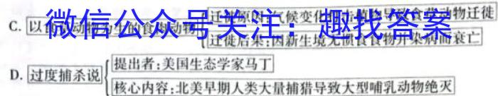 迁徙原因:气候变化打击植物导致食草动物迁徙C.以食草动物为生的食肉动物迁徙后果:因新生境无惯食食物并染病而衰亡提出者:美国生态学家马丁D.过度捕杀说核心内容:北美早期人类大量捕猎导致大型哺乳动物绝灭