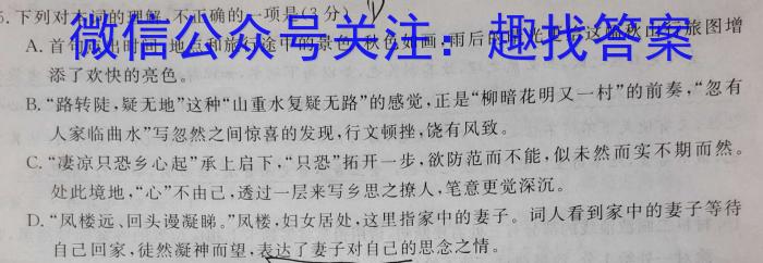 15.下列对本词的理解,不正确的一项是(3分)DA.首句点出时间、地点和旅行途中的景色,秋色如画,雨后的晴光更给这幅秋山行旅图增添了欢快的亮色。B.“路转陡,疑无地”这种“山重水复疑无路”的感觉,正是“柳暗花明又一村”的前奏,“忽有人家临曲水”写忽然之间惊喜的发现,行文顿挫,饶有风致。C.“凄凉只恐乡心起”承上启下,“只恐”拓开一步,欲防范而不能,似未然而实不期而然。处此境地,“心”不由己,透过一层来写乡思之撩人,笔意更觉深沉。D.“凤楼远、回头谩凝睇。”凤楼,妇女居处,这里指家中的妻子。词人看到家中的妻子等待自己回家,徒然凝神而望,表达了妻子对自己的思念之情。