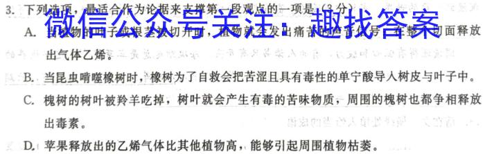 3.下列选项,最适合作为论据来支撑第一段观点的一项是(3分)A.当植物的叶子或根茎被切开时,植物就会发出痛苦的声音信号:在整个切面释放B.当昆虫啃噬橡树时,橡树为了自救会把苦涩且具有毒性的单宁酸导入树皮与叶子中。C.槐树的树叶被羚羊吃掉,树叶就会产生有毒的苦味物质,周围的槐树也都争相释放出毒素。D.苹果释放出的乙烯气体比其他植物高,能够引起周围植物枯萎。
