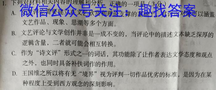 1.下列对材料相关内容的理解和分析,正确的一项是(3分)A.文艺评论需要建立在文艺欣赏和理论支撑的基础上,其评论对象可以涵盖文艺作品、现象、思潮等多个方面。B.文艺评论与文学创作并非是一成不变的,当评论中的描述文本缺乏深厚的逻辑含量,二者就可能会相互转换。C.作为“诗文评”形式之一的词话,其功能除了让作者表达文学态度和观点之外,也同时具备补佚词作的作用。D.王国维之所以将有无“境界”视为评判一切作品优劣的标准,是因为在某种程度上受到西方观念的深刻影响。