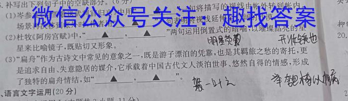 16.补写出下列句子中的空缺部分。(6分)万(1)岑参在《白雪歌送武判官归京》中用“▲”一句将描写的视线由帐外转到帐内。场景再次移到帐外时,作者用“▲”一句表明将视线延伸至广阔的沙漠。(2)杜牧《阿房宫赋》中,“▲,▲”两句运用倒置式的暗喻,以璀璨晶亮的星星来比喻镜子,既贴切又形象。明星荧形镜也(3)“扁舟”作为古诗文中常见的意象之一,既是游子漂泊的凭靠,也是其羁旅之愁的寄托,更是追求自由、失意隐居的媒介,它承载着中国古代文人淡泊世事、悠然自得的情感,形成了独特的扁舟情结,如“▲,三、语言文字运用(20分)▲架一叶十之举匏梅以相属