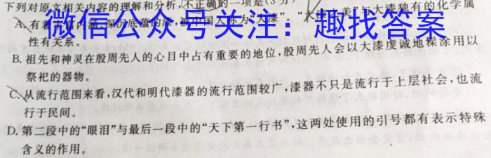 1.下列对原文相关内容的理解和分析,,不正确的一项是(3分)DA.有着丰富内涵、深沉底蕴的漆,被中国人称为“大漆”“大漆之美”与大漆独有的化学属性有关系。B.祖先和神灵在殷周先人的心目中占有重要的地位,殷周先人会以大漆虔诚地涂用以祭祀的器物。C.从流行范围来看,汉代和明代漆器的流行范围较广,漆器不只是流行于上层社会,也流行于民间。D.第二段中的“眼泪”与最后一段中的“天下第一行书”,这两处使用的引号都有表示特殊含义的作用。