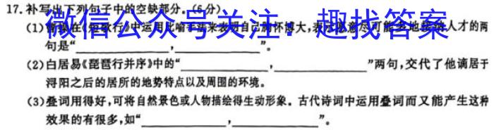 17.补写出下列句子中的空缺部分。(6分)(1)曹操在《短歌行》中运用比喻手法来表明自己胸怀博大,表示愿意尽可能多地接纳人才的两句是“,”.(2)白居易《琵琶行并序》中的“,”两句,交代了他谪居于浔阳之后的居所的地势特点以及周围的环境。(3)叠词用得好,可将自然景色或人物描绘得生动形象。古代诗词中运用叠词而又能产生这种效果的有很多,如“,”.