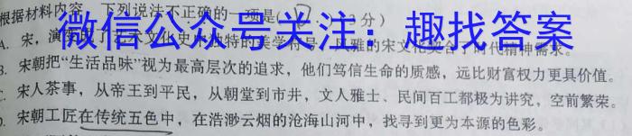 根据材料内容,下列说法不正确的一项是(D.)(3分)A.宋,演变成了艺术文化史中独特的美学符号,风雅的宋文化契合了时代精神需求。B.宋朝把“生活品味”视为最高层次的追求,他们笃信生命的质感,远比财富权力更具价值。C.宋人茶事,从帝王到平民,从朝堂到市井,文人雅士、民间百工都极为讲究,空前繁荣。D.宋朝工匠在传统五色中,在浩渺云烟的沧海山河中,找寻到更为本源的色彩。
