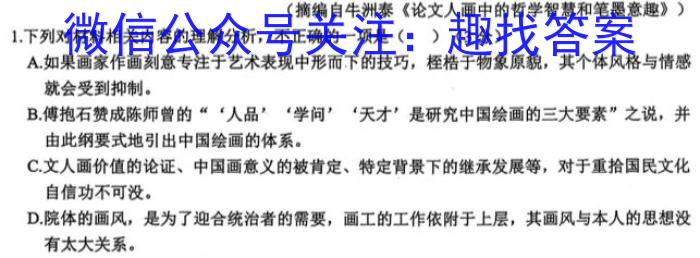 (摘编自牛洲泰《论文人画中的哲学智慧和笔墨意趣》)1.下列对材料相关内容的理解分析,不正确的一项是()(3分)A.如果画家作画刻意专注于艺术表现中形而下的技巧,桎梏于物象原貌,其个体风格与情感就会受到抑制。B.傅抱石赞成陈师曾的“‘人品’‘学问’‘天才’是研究中国绘画的三大要素”之说,并由此纲要式地引出中国绘画的体系。C.文人画价值的论证、中国画意义的被肯定、特定背景下的继承发展等,对于重拾国民文化自信功不可没。D.院体的画风,是为了迎合统治者的需要,画工的工作依附于上层,其画风与本人的思想没有太大关系。