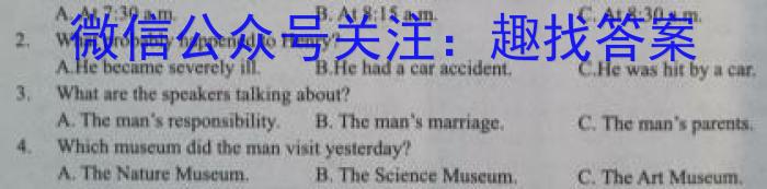 AA. At 7:30 a.m. B.At 8:15 am. At830a2. What probably happened to Henry?A.He became severely ill.B.He had a car accidentC.He was hit by a car.3. What are the speakers talking about?A. The man's responsibility.B. The mans marriage.C. The man’s parents.4. Which museum did the man visit yesterday?A. The Nature Museum.B. The Science Museum.C. The Art Museum.