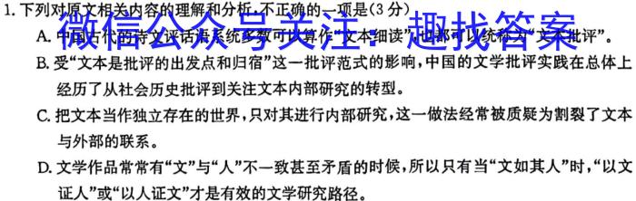 1.下列对原文相关内容的理解和分析,不正确的一项是(3分)A.中国古代的诗文评话语系统多数可以算作“文本细读”,也都可以统称为“文本批评”。B.受“文本是批评的出发点和归宿”这一批评范式的影响,中国的文学批评实践在总体上经历了从社会历史批评到关注文本内部研究的转型。C.把文本当作独立存在的世界,只对其进行内部研究,这一做法经常被质疑为割裂了文本与外部的联系。D.文学作品常常有“文”与“人”不一致甚至矛盾的时候,所以只有当“文如其人”时,“以文证人”或“以人证文”才是有效的文学研究路径。