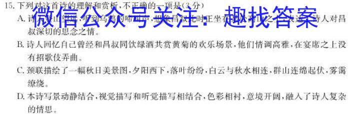 15.下列对这首诗的理解和赏析,不正确的一项是(3分)A.诗人登山望远,听到乌鸦的啼叫声,想象昌叔此时正坐在某处高山之上,表达了诗人对昌叔深切的思念之情。B.诗人回忆自己曾经和昌叔同饮绿酒共赏黄菊的欢乐场景,他们情调高雅,在宴席之上没有招歌伎弄曲。C.颈联描绘了一幅秋日美景图,夕阳西下,落叶纷纷,白云与秋水相连,群山连绵起伏,雾霭缭绕。D.本诗写景动静结合,视觉描写和听觉描写相结合,色彩相衬,意境开阔,融人了诗人复杂的情思。