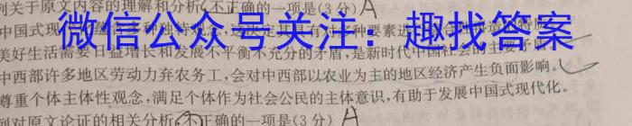 1.下列关于原文内容的理解和分析(摘编自戴木才《中国式现代化的基本特质》)所不正确的一项是(3分))AA.中国式现代化蕴含多种独特观念,这决定其具有对多种要素进行综合性再造的特质。B.美好生活需要日益增长和发展不平衡不充分的矛盾,是新时代中国社会的主要矛盾。分的C.中西部许多地区劳动力弃农务工,会对中西部以农业为主的地区经济产生负面影响。。D.尊重个体主体性观念,满足个体作为社会公民的主体意识,有助于发展中国式现代化
