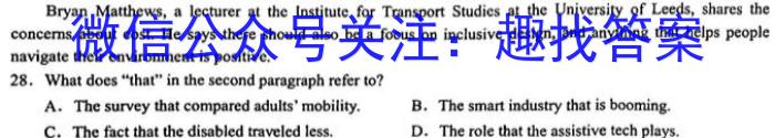Bryan Matthews, a lecturer at the Institute for Transport Studies at the University of Leeds, shares theconcerns about cost. He says there should also be a focus on inclusive design, and anything that helps peoplenavigate their environment is positive.28. What does “that” in the second paragraph refer to?A.The survey that compared adults' mobility.B.The smart industry that is booming.C.The fact that the disabled traveled less.D.The role that the assistive tech plays.