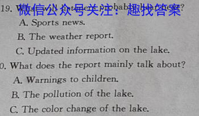 19. What will listeners probably hear next?A. Sports news.B. The weather report.C. Updated information on the lake.20.What does the report mainly talk about?A. Warnings to children.B.The pollution of the lake.C. The color change of the lake.(2Which of the following animals feed on plants?A. Box jellyfish and African buffaloes.B. Box jellyfish and saltwater crocodiles.C.African elephants and African buffaloes.D.SaIt water crocodiles and African elephants.D23. What do these four kinds of animals have in common?