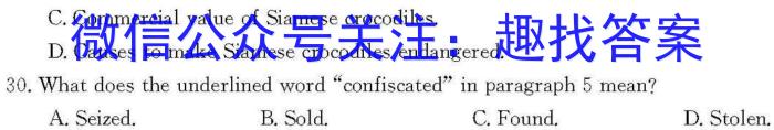 C.(Commercial value of Siamese crocodiles.D.Causes to make Siamese crocodiles endangered.30.What does the underlined word“confiscated”in paragraph 5 mean?A.Seized. B.Sold. C.Found. D..Stolen.____