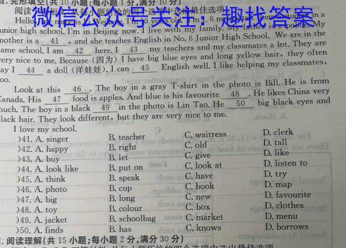 M.完形填空(共10小题;每小题1分,满分10分)阅读下面短文,从每小题所给的四个选项中选出最佳选项。Hello, my name is Li Wei kang. I'm 13 years old. Im 1.6 metres t all. Iam a student in ajunior high school. I'm in Beijing now. I live with my family. My father is a police. Mymother is a 41 and she teaches English in No. 6 Junior High School. We are in thesame school . I am 42 here.I 43 my teachers and my classmates a lot. They are____very nice to me. Because(因为) I have big blue eyes and long yellow hair, they oftensay I 44 a doll(洋娃娃) .I can 45 English well. I like helping my classmates,too.Look at this 46. The boy in a gray T-shirt in the photo is Bill. He is fr or____Canada. His 47 food is apples. And blue is his favourite 48 . He likes China verymuch. The boy in a black 49 in the photo is Lin Tao. He 50big black eyes andblack hair. They look different, but they are very nice to me.I love my school.( ) 41.A.singer B.teacher C.waitress D.clerk( ) 42. A. happy B.right C.oldbodD.tallool lo ab() 43.A. buy B.let C.give D.like() 44.A. look like B.put onn bao i C. look at D.listen to( ) 45.A.think B.speak da a C.have D.try() 46.A.photo B.cup C.book D.map( ) 47.A. big B.long C. new D.favourite( ) 48.A. toy B.colourdon nC.box D.clothes( ) 49. A.jacket B.school bag C.market D.menu( ) 50. A. finds B.has C.knowsD.borrowsⅧ.阅读理解(共15小题;每小题2分,满分30分)