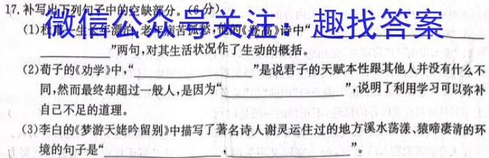 17.补写出下列句子中的空缺部分。(6分)(1)杜甫一生长年漂泊,老年病苦孤愁,他的《登高》诗中“”两句,对其生活状况作了生动的概括。(2)荀子的《劝学》中,“”是说君子的天赋本性跟其他人并没有什么不同,然而最终却超过一般人,是因为“”,说明了利用学习可以弥补自己不足的道理。(3)李白的《梦游天姥吟留别》中描写了著名诗人谢灵运住过的地方溪水荡漾、猿啼凄清的环境的句子是“v”s