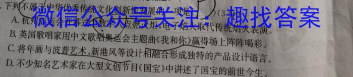 9.下列不属于中华优秀传统文化创新性发展的一D(3分)A.杭州亚运会开幕式上数字人点燃火炬,电子焰火取代传统焰火表演。B.英国歌唱家用中文歌唱奥运会主题曲《我和你》赢得场上阵阵喝彩C.将年画与波普艺术、新港风等设计相融合形成独特的产品设计语言D.不少知名艺术家在大型文创节目《国宝》中讲述了国宝的前世今生。