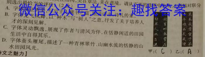 1.书法之美,美在点画,美在结构,美在章法,美在意境。请从下面的选项中为甲、乙两幅对联分别选出最恰当的评价。(2分)A.字体端正秀美,写出主人藏书之富,饱读诗书,诗礼传家。B.字体龙飞凤舞,以“种木”写“树人”之意,抒发了关于培养人才的深刻见解。C.字体灵动飘逸,展现了作者与清风为伴,在恬静闲适的田园生活中自得其乐。D.字体蚕头雁尾,描述了一种青林翠竹、山幽水流的恬静的山水田园风光。