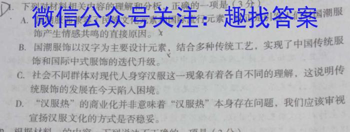D下列对材料相关内容的理解和分析,正确的一项是(3分)A.国潮服饰兼容了民族文化元素和国际流行元素,这正是引发人们对国潮服饰产生情感共鸣的直接原因。xB.国潮服饰以汉字为主要设计元素,结合多种传统工艺,实现了中国传统服饰和国际中式服饰的迭代升级。C.社会不同群体对现代人身穿汉服这一现象有着各自不同的理解,这说明传统服饰的发展在今天陷入困境。D.“汉服热”的商业化并非意味着“汉服热”本身存在问题,我们应该审视宣扬汉服文化的方式是否稳妥。