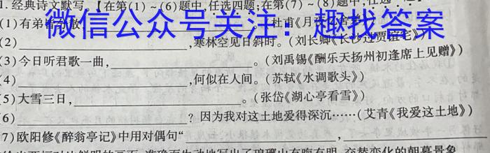 1.经典诗文默写。【在第(1)~(6)题中,第(1)~(6)题中,任选四题;在第(7)~(8)题中,任选一题】((6分)有弟皆分散,)。(杜甫《月夜忆舍弟》)(2),寒林空见日斜时。(刘长卿《长沙过贾谊宅》)(3)今日听君歌一曲,。(刘禹锡《酬乐天扬州初逢席上见赠》)(4),何似在人间。(苏轼《水调歌头》)(5)大雪三日,。(张岱《湖心亭看雪》)(6)?因为我对这土地爱得深沉…(艾青《我爱这土地》)