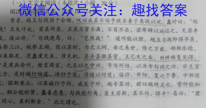 (一)文言文阅读(本题共5小题,20分)阅读下面的文言文,完成10~14题。昔者,越王勾践困于会稽,叹曰我其不伯乎欲杀妻子角战以死。蠡对曰:“殆哉!王失计也,爱其所恶。且吴王贤不离,不肖不去,若卑辞以地让之,天若弃彼,彼必许。”勾践晓焉,曰:“岂然哉!”“岂然哉!”遂听能以胜。越王幻践即得平吴,春祭三江,秋祭五湖。因以其时,为之立祠,垂之来世,传之万载。邻邦乐德,以来取足。范蠡度天关,涉天机。其去甚微甚密,王已失之矣,然终难复见得。于是度兵徐州,致贡周室,元王以之中兴,号为州伯,以为专勾践之功,非玉室之力。是时越行伯道、沛归于宋;浮陵以付楚;临沂、开阳,复之于鲁。中邦侵伐、因斯衰止。以其诚行于内,威发于外,越专其功,故曰越绝是也。管仲能知人,桓公能任贤,蠡善虑患,勾践能行焉。臣主若斯,其不伯,得乎?易曰:“君臣同心,其利断金。”此之谓也。