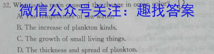 32.What is the main cause of the change in ocean color?A.The temperature of sea water.B.The increase of plankton kinds.C.The growth of small living things.D. The thickness and spread of plankton.