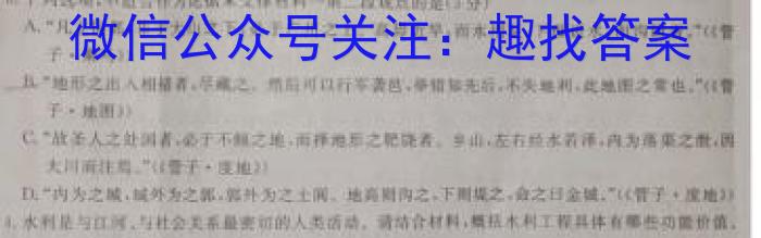 3.下列选项,不适合作为论来支撑材料一第二段观点的是(3分)A.“凡立国都,非手大山之下,必于广川之上,高毋近,而水用是:下母近水,而淘防省。”《管子·乘马》)B.“地形之出人相着,之,然后可以行军袭芭,举错知先后,不失地利,此地图之靠也,“《管子·地图)C.“故人之处国者,必于不倾之地,面择地形之肥着,乡山,左右经水若泽,内为落之激,因大川面注焉,”管子·度地))D.“内为之城,城外为之郭,郭外为之土间,地高沟之,下堤之,命之日金城管子·度地》4利是与江河,与社会关系最密切的人类活动,请结合材料,概水利工程具体有些功能价值,